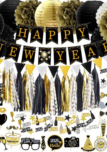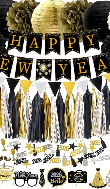 2026 New Years Eve Party Decorations Set, 62 Pieces, Black and Gold